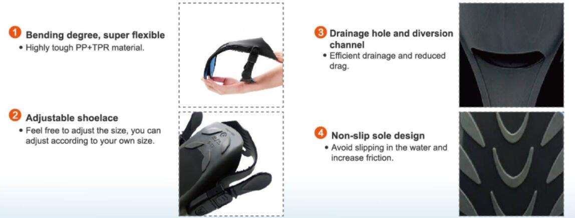 [Instructions for use]: Fins are an auxiliary tool for increasing speed, reducing drag, and propelling power for swimming and diving. The foot-type flippers wrap the entire sole of the foot with a foot cover. The foot cover flippers are softer when snorkeling, which can reduce the flippers to the water surface.