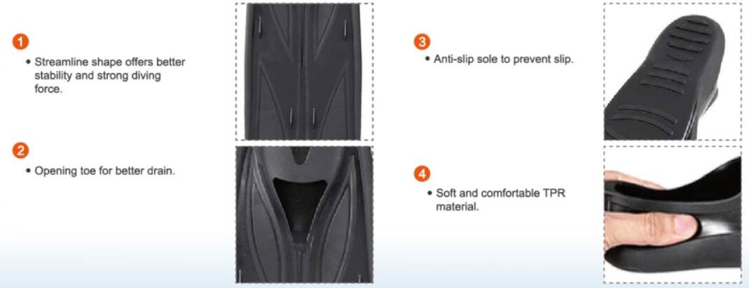 [Instructions for use]: Fins are an auxiliary tool for increasing speed, reducing drag, and propelling power for swimming and diving. The foot-type flippers wrap the entire sole of the foot with a foot cover. The foot cover flippers are softer when snorkeling, which can reduce the flippers to the water surface.