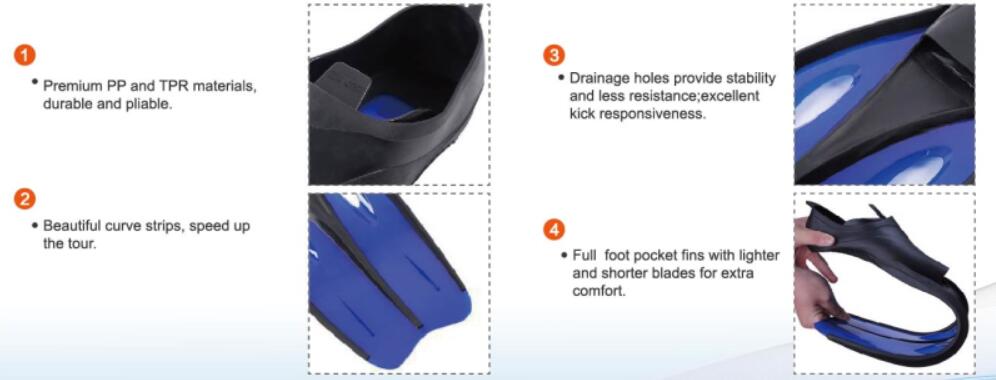 [Instructions for use]: Fins are an auxiliary tool for increasing speed, reducing drag, and propelling power for swimming and diving. The foot-type flippers wrap the entire sole of the foot with a foot cover. The foot cover flippers are softer when snorkeling, which can reduce the flippers to the water surface.