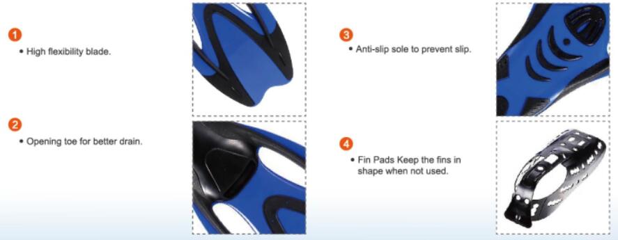 [Instructions for use]: Fins are an auxiliary tool for increasing speed, reducing drag, and propelling power for swimming and diving. The foot-type flippers wrap the entire sole of the foot with a foot cover. The foot cover flippers are softer when snorkeling, which can reduce the flippers to the water surface.