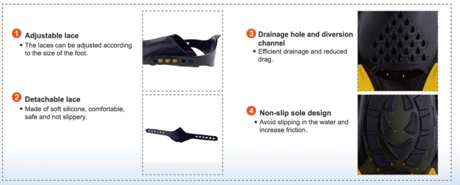 [Instructions for use]: Fins are an auxiliary tool for increasing speed, reducing drag, and propelling power for swimming and diving. The foot-type flippers wrap the entire sole of the foot with a foot cover. The foot cover flippers are softer when snorkeling, which can reduce the flippers to the water surface.