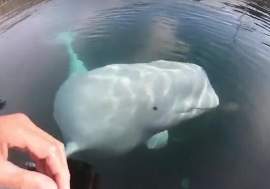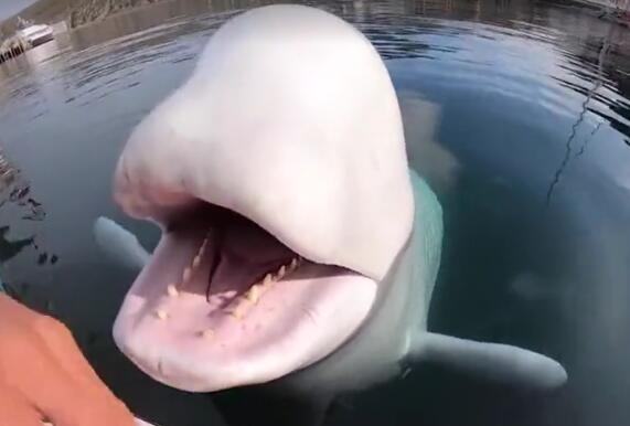 According to media reports on September 23, a white dolphin arrived in a kayak recently by diver Mr. Joachim Larsen at the port of Hammerfest Bay in Norway. He photographed the precious moment with a small waterproof camera, but accidentally fell into the water. Unexpectedly, the dolphin helped him pick it up again.